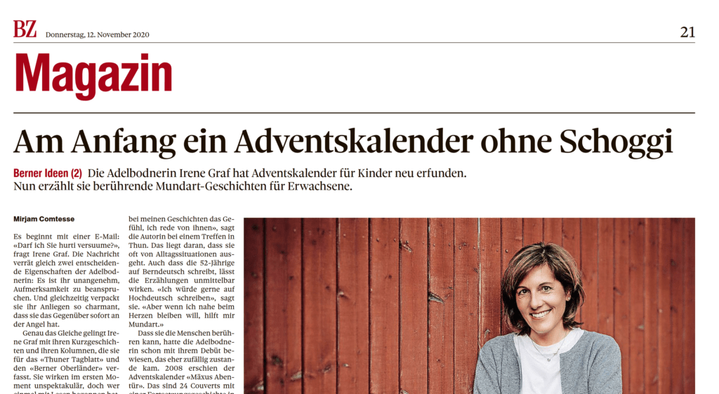 Der grosse Bericht im Magazin der Berner Zeitung vom 29.11.2017 … «Viral», bevors das Wort gab… und was das mit unseren Geschichten zu tun hat. Schöner Artikel über uns, die Kalender und die Neuerscheinung «Schmucktruckli