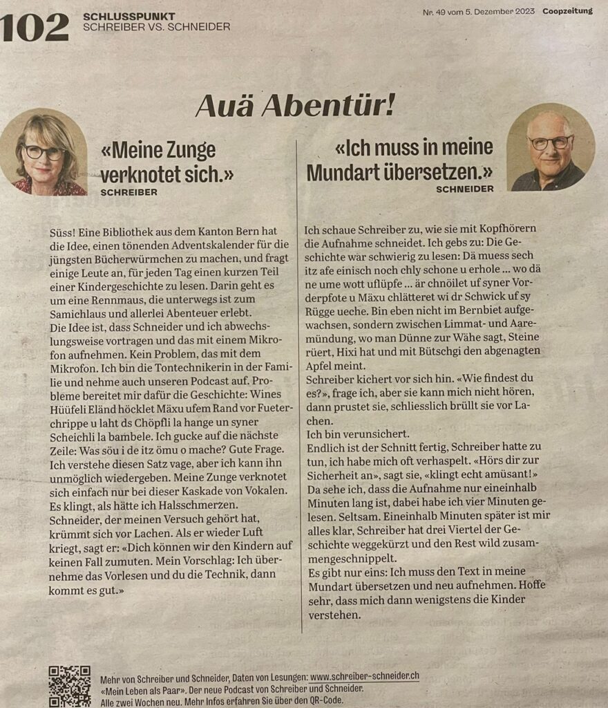 So tönt es, wenn Christina Lang und Britta Spichiger drei verschiedene Adventskalendergeschichten besprechen, und eine davon ist Mäxus Abentür.