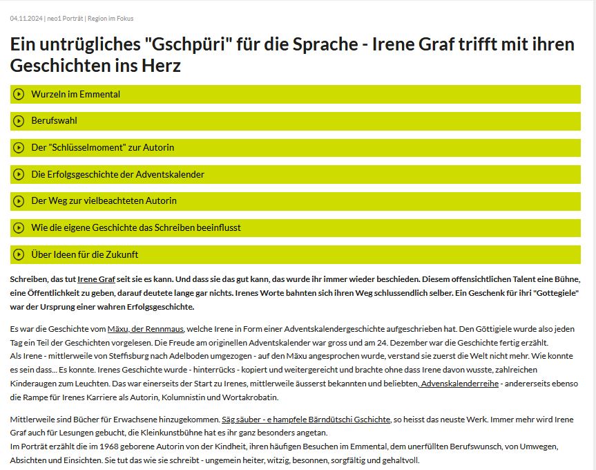 Mundartredaktor André Perler spricht mit Irene über ihr Schreiben, über ihr neues Buch und über sonst noch so Züüg, halt.