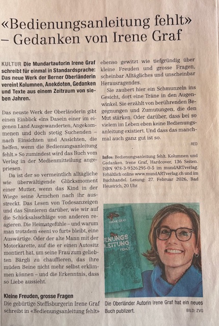 Das neuste Werk der Oberländerin gibt Einblick ins Dasein einer im eigenen Land „Ausgewanderten“, Angekommenen und doch stetig Suchenden – nach Einsichten und Ansichten, die helfen, wenn die Bedienungsanleitung fehlt.